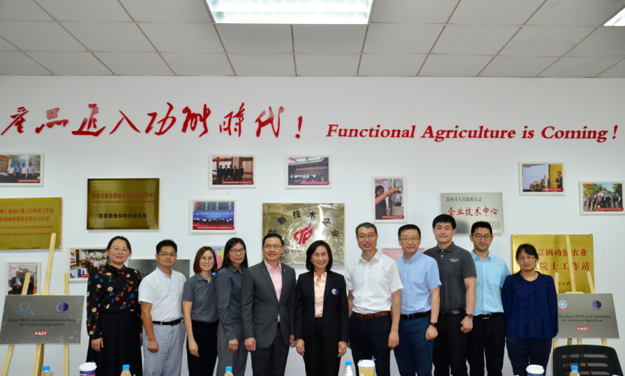 2019年8月15日,由泰國科學院(TISTR)院長Chutima Eamchotchawalit博士帶隊,副院長Sayan Tanpanich、創新農業中心主任Rochana Tangkoonboribun博士以及研究員Khanok-on Amprayn博士等一行四人組成的考察團,赴蘇考察中國功能農業發展、商討合作事宜。尹雪斌博士作為功能農業的主要推動者,帶領硒谷科技團隊接待本次泰國來訪團考察。中國科學技術大學蘇州研究院常務副院長屠兢、獨墅湖科教創新區管委會副主任周育才、蘇州工業園區經濟發展委員會副處長史永展、中國科學院曼谷創新合作中心創新合作部主管楊子鋒等出席了簽約揭牌儀式。